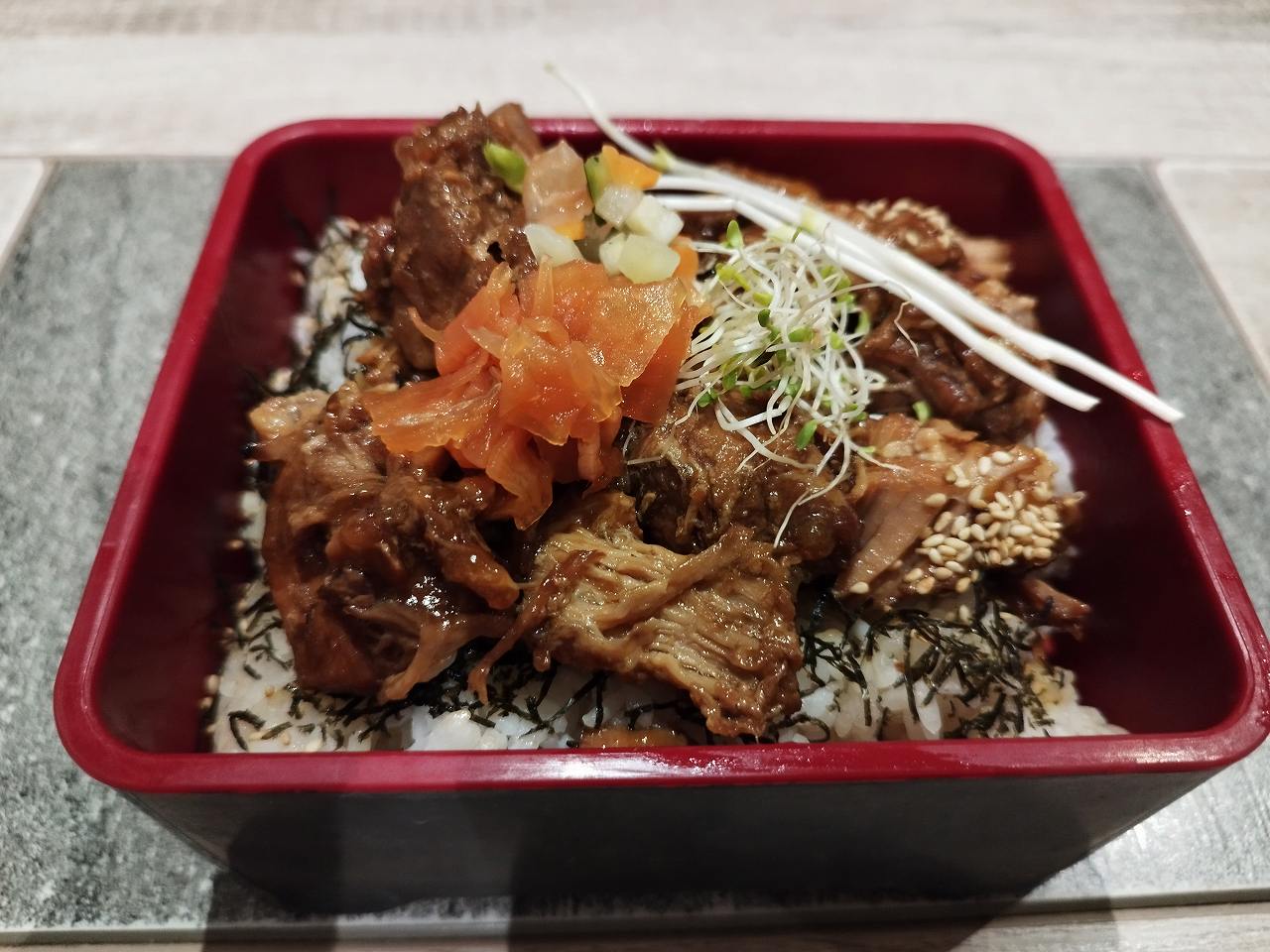 Riz blanc recouvert de porc mijoté au saké et sauce sojà. |